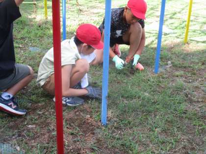 1時間目に全校草引きがありました。総合遊具の周りの雑草を抜くのが5年生の担当でした。たくさん引いたので、大きな袋2つがいっぱいになり、総合遊具の下にびっしりと生えていた雑草が、きれいになくなりました。
