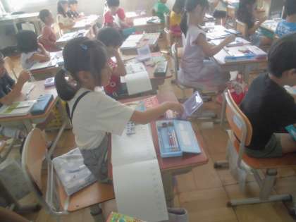 3つの数の計算の学習を始めました。数図ブロックと関連つけて式を考えています。