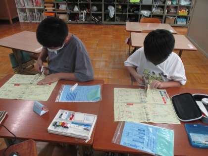3組の5、6年生の家庭科では、裁縫の学習が始まりました。今日は、裁縫セットを開けて、用具について名前や使い方を確かめたり、裁ちばさみで布を切ったり、針に糸を通したりしました。とても集中して行っていました。