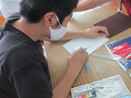 チャコペンで印を付けて、裁ちばさみで布を裁断し、針と糸を使って波縫いを頑張りました。