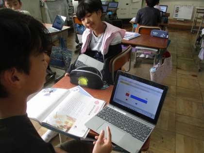 道徳「のりづけされた詩」主人公の和枝の気持ちを中心に考えて、話し合いました。人の詩を使ってしまった気持ちについて、「悪いこととはわかっているが、自分だけ詩ができていないので、やってしまった。少しくらいいいと思った。」など、人間には弱いところがあるんだということを確認した後、引用した詩をほめられてどんな気持ちかを話し合いました。心情メーターでどんな気持ちかを示してペアで行いました。「自分がつくっていないから、ばれないか不安だから青が90%」「人の詩だからほめられてもうれしい気持ちがしないから、青が80%」など、理由を伝え合っていました。最後に先生に話した後の心情もメーターで表しました。