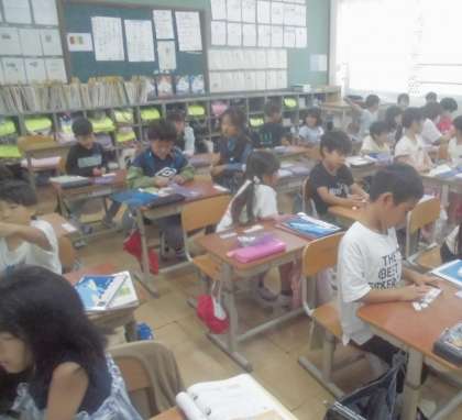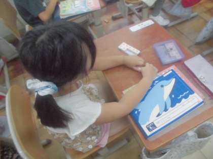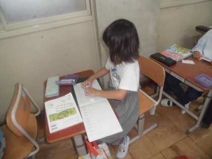 くりあがりのある足し算です。まず数図ブロックを使って練習をしました。そのあとブロックと言葉を使って説明できるように頑張りました。10をつくることを大切だと子ども達は意見を言っていました。