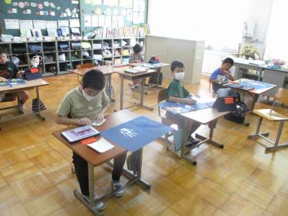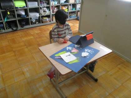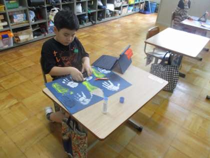 先日、画用紙に自分の足型や手形をとりました。その形をもとに、折り紙やマジック等を使ってハロウィンのイメージになるように作品作りをしています。いろいろ工夫しながら楽しそうです。