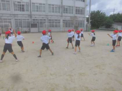 運動場でリズムダンスをしました。そろえるとかっこいいからみんなでそろえたいと子ども達は言っていました。