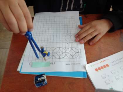 「どうなってるの?」と書き始めるまえは戸惑いだらけでしたが、中心と半径の長さが分かり、円をかき進めるうちにコツを掴んだ子もいました。