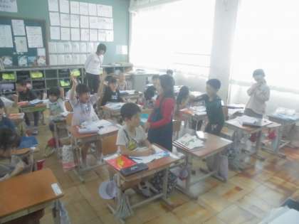「」のセリフの音読の工夫を考えました。くじらぐも、子ども、先生がどのようにセリフを言うのかを考えていました。動きもつけて音読をしていました。