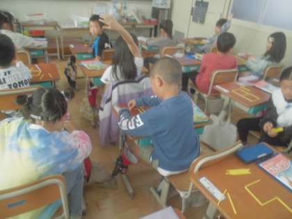 色板を1枚動かして違う形にすることについて考えました。ずらしたり、回したり、裏返したりして違う形にすることができました。また、棒を動かして8を違う数字にすることについて考えて、実際に動かしてしました。