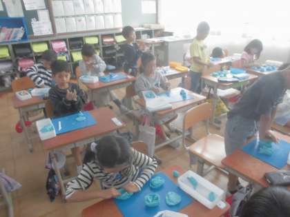 油粘土を使って自分だけのごちそうを考えて作りました。