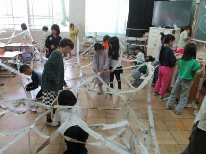 細く切った紙をつないだりつるしたりしてく学習でした。