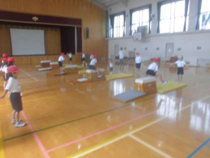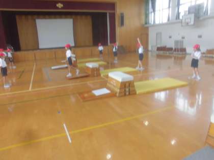 横開脚とびをしました。踏み切りの仕方は「ドン」として前を向いてすると跳びやすいと気づいて発表をしてくれました。たくさん練習して跳べるように頑張っていきたいです。