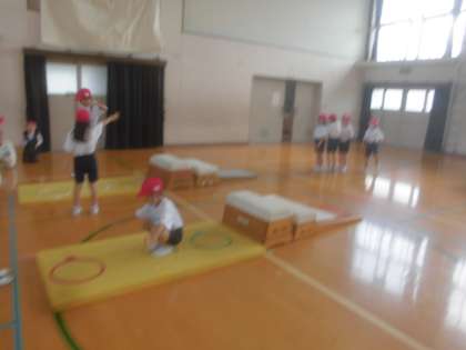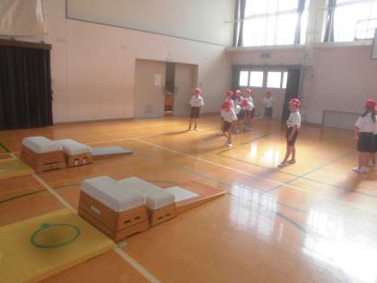 とびばこあそびで遊びの場を色々設定して活動をしました。ペアで活動をしています。どのようにするといいのかをアドバイスしたり、良いところをほめたりしていました。