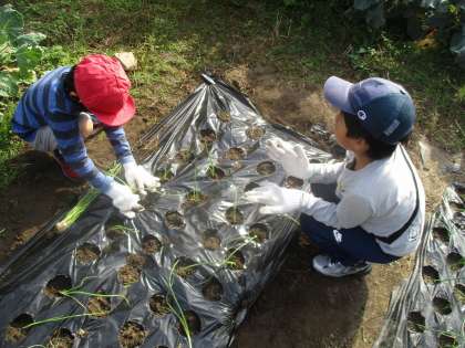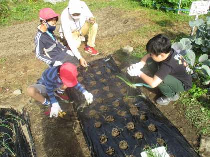 今日はたまねぎの苗を植えました。マルチシートの穴を空けたところに、スコップで上手く土を掘って、1本1本丁寧に植えていきました。たくさんの苗がありましたが、みんなで協力して植えることができました。収穫するのは3〜4月になりますが、これからの成長が楽しみです。