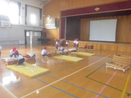 とびばこあそびで様々な遊びを取り組みました。初めて縦開脚ができたり横開脚ができたりしました。とても喜んでいました。