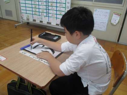 3年生の習字では、名前を書く時にはいつもは細筆を使うのですが、今日は筆ペンを使って書いてみました。感覚が違うので、どのくらいの力加減で書くと上手に書けるのかを練習してから書きました。