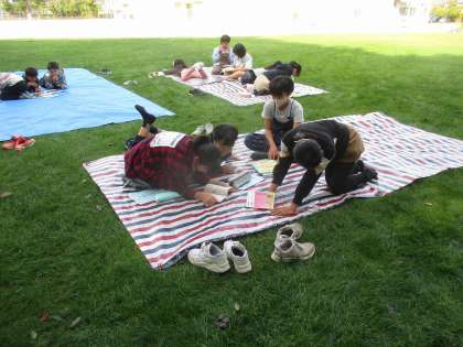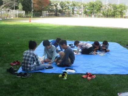 9日(木)晴天の下、青空読書がありました。芝生でゆったりと友だちと一緒に楽しみながら読書をしていました。青空読書でたくさん読んだので、どんぐり読書月間の目標500ページを達成した人もいました。