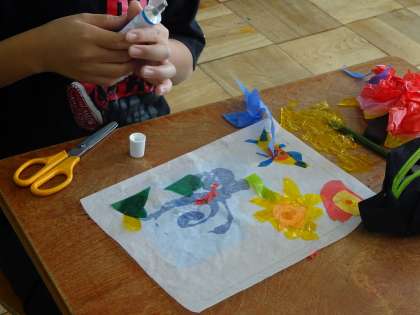セロハンやお花紙といった光を通す素材を使って、○○の世界を作っています。教室にさしこむ日光に作品をかざして出来上がりを見ながら、みんな熱心に作成しています。