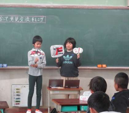 各グループの発表を見合い、意見交流をしました。どのグループも工夫して分かりやすく伝えようとしていました。字の大きさや文字の多さなどについてアドバイスをするなど、よいよい発表にするために真剣に聞きあっていて、よかったです。