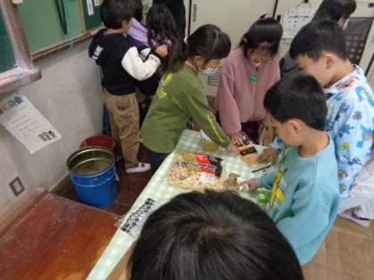 今週、食の学習で栄養教諭の先生から「大豆のはたらき」や「大豆がどんな食品に変身しているのか」を教えてもらいました。国語でも学習していることもあり、子どもたちは興味深く先生の話を聞いていました。