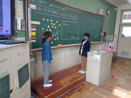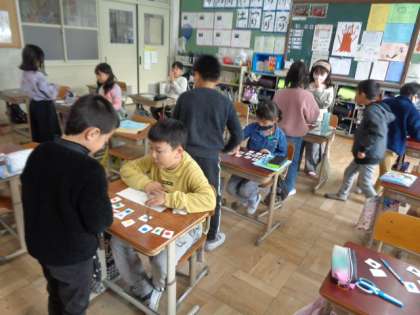 今回はお店屋さんとお客さんになって、自分が欲しい色と形カードを買いにいきました。