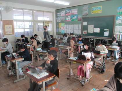 外国語の学習で、一人一人がどこの都道府県かを当ててもらう「都道府県クイズ」を作りました。インターネットで画像を検索して、ロイロノートに貼り付けてクイズを作ります。出来上がったクイズは、英語でヒントを言います。みんな上手にクイズを作ることができましたが、時間がなくて全員出題することができませんでした。まだ出題できていない人は、次の外国語の時間に行います。