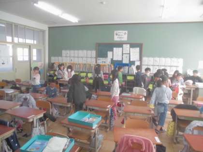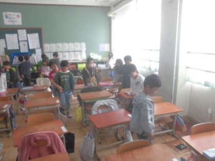 色の言い方の学習をしました。みんなで教室にどんな色のものがあるのかを探しています。