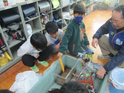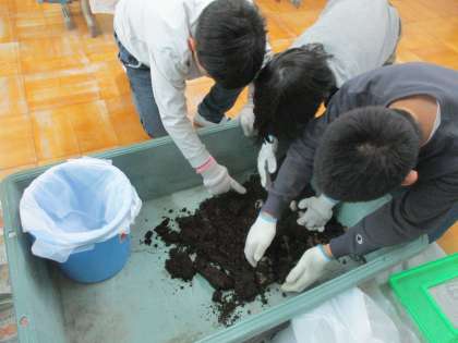 今日はクラスで育てているカブトムシの幼虫のマット交換をしました。