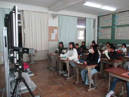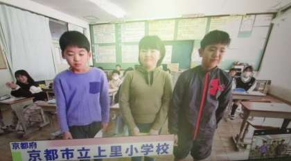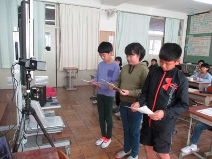 10時30分教室開始。アナウンサーの人が司会となり、教室が始まりました。少し緊張しながらも学校紹介がありました。愛知県から2校、東京都から1校の参加でした。上里小の魅力を伝えるため、特徴的な校舎、命の森と動物村、いろりの間を紹介しました。