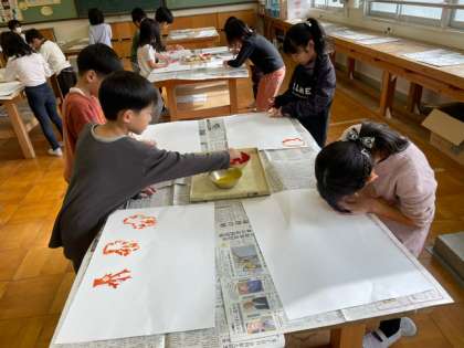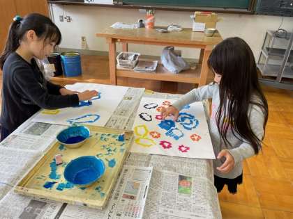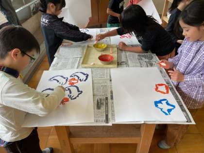 絵の具を付けて型紙を取ったときにうまく形ができていて、とても嬉しそうでした。どこに写そうか、何色にしようかと、いっぱい考えていました。