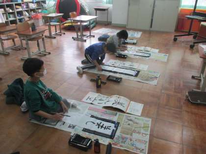 本日2年生・4年生児童たちは画仙紙を使った書初めに挑戦しました。