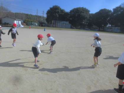 持久走に向けて、4分間走りました。自分のペースを見つけられるように頑張っています。その後は、大縄とびをグループでしました。