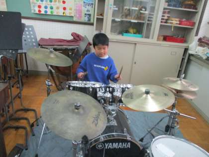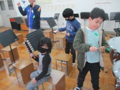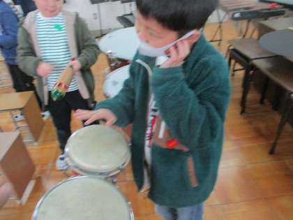 小さな打楽器や大きな打楽器を使って演奏を楽しみました。