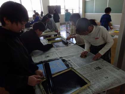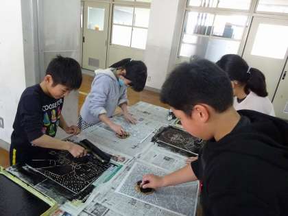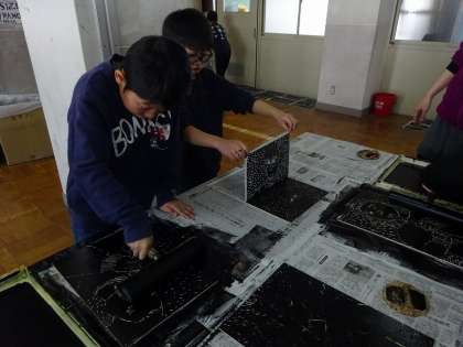 初めての彫刻刀で彫った版木を使って、刷る活動をしました。初めての木版画にドキドキしながらもインクをつけたり、バレンでこすったり、よい作品になるよう頑張っていました。
