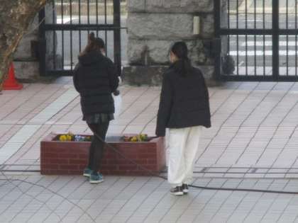 冬休みが明けて、花壇には新しい花が並んでいます。