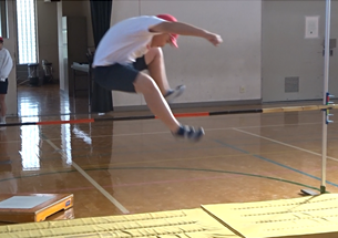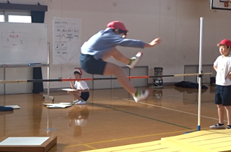 1・2・1・2・3!のリズムで助走・ふみきりし、足を高く上げてバーを跳び越えます。だんだんとリズミカルに助走できるようになってきて、バーの高さも少しずつ高くなってきています。自分の目標の高さに向かって、頑張っています!!