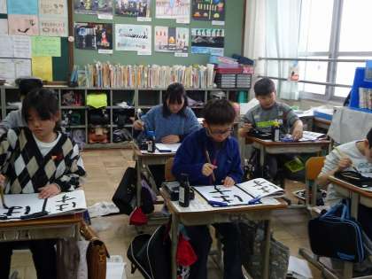 今回は「はす」と書きました。ひらがなは、漢字と違い丸みをおびているので、いつもよりみんな苦戦していました。特に「は」には横の結び、「す」には縦の結びが入っており、ひらがなの中でも難しい文字です。どんな筆づかい、力の入れ具合で書けばよいのか、学んだことを生かしながら書いていました。