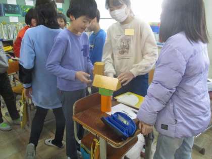今日は、箱や模型を使って、角柱と円柱の特徴を調べました。