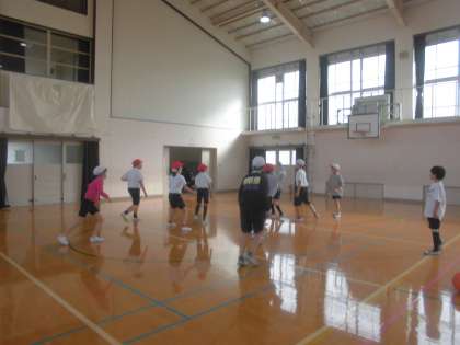 「ゴールの四角になっている枠を狙うといいよ。」「相手が取りやすいように両手でパスしよう。」と、得意な子がアドバイスを丁寧にしながら練習している様子が見られました。