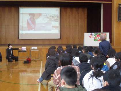 青森県、京果の方に来ていただき、りんごについての学習がありました。オンラインでミス青森の方もご参加いただき、いろいろな質問に答えていただいたり、現在の青森市の様子を映像で伝えていただいたりしました。