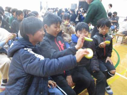 りんごの袋がけ体験やサンフジと王林の食べ比べもありました。酸味と甘みのバランスがあり、とてもジューシなサンフジ、とても甘みがあり、食べやすい王林、どちらも子どもたちには人気がありました。