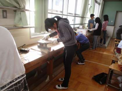電動のこぎりでおもいおもいの形に切っていきました。板をしっかりとおさえていないと切れないので、苦労していました。切った人から、色付けをしていきました。