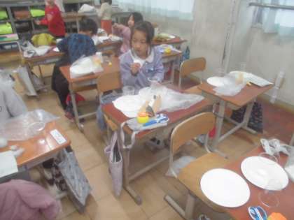 かみざらコロコロを作っています。紙皿と紙カップをボンドでつけます。しっかりとつけてコロコロ転がるものを作ります。