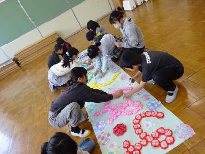 6年生の卒業を祝う掲示物づくりをしました。折り紙や切り紙で飾って「おめでとう!」の言葉をつくりました。