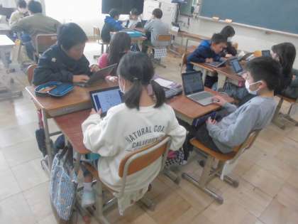 5年生の社会では、自分たちで調べ学習を行い、ロイロノートを使ってまとめていました。