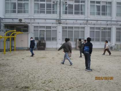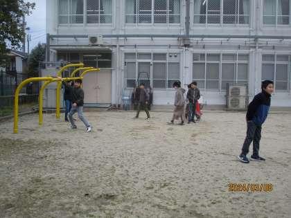 砂場を牢屋にして、みんなで楽しんでいました。寒いけれど、友だちを追いかけたり、逃げたりして、体も温まりました。