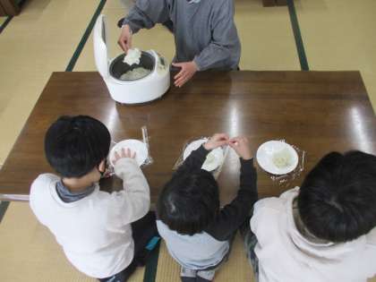 今日の5時間目は、2・5年生が育ててくれたもち米を使って、ごへいもち作りをしました。