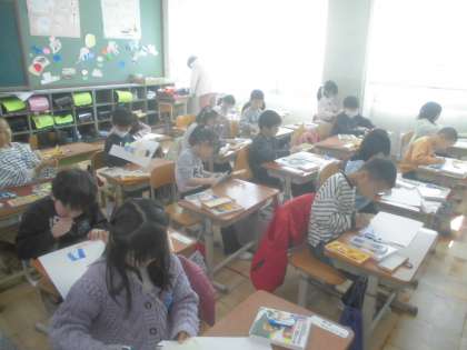 来年の1年生のために教室を飾っています。遊んでいる絵や花などを描いています。