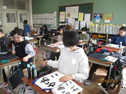 5年生最後の書写の時間でした。今日は、あこがれの4文字なので、文字の大きさや筆順に気を付けて書きました。