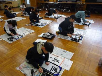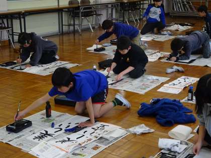 今回は床に座って、いつもよりも長い画仙紙に書くことに挑戦しました。よくお手本を見て、文字の大きさに気をつけながら書いていました。