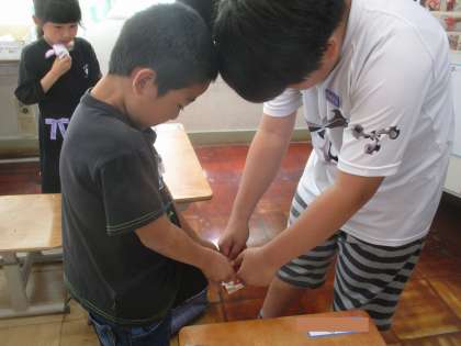 今日は給食の時間に1年生の教室に行って、給食の時のお手伝いをしました。牛乳パックの開き方をていねいに教えてあげるなど、頼もしい姿が見られました。