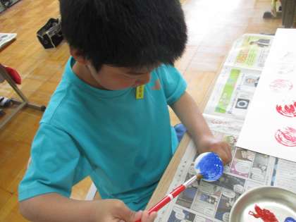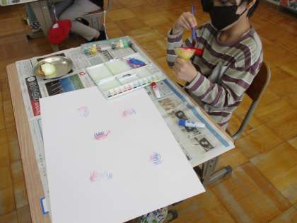 断面に絵の具で色を付けて、スタンプします。